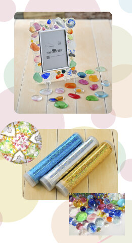 キラキラガラスのナギットを組み合わせて写真立てを制作します。